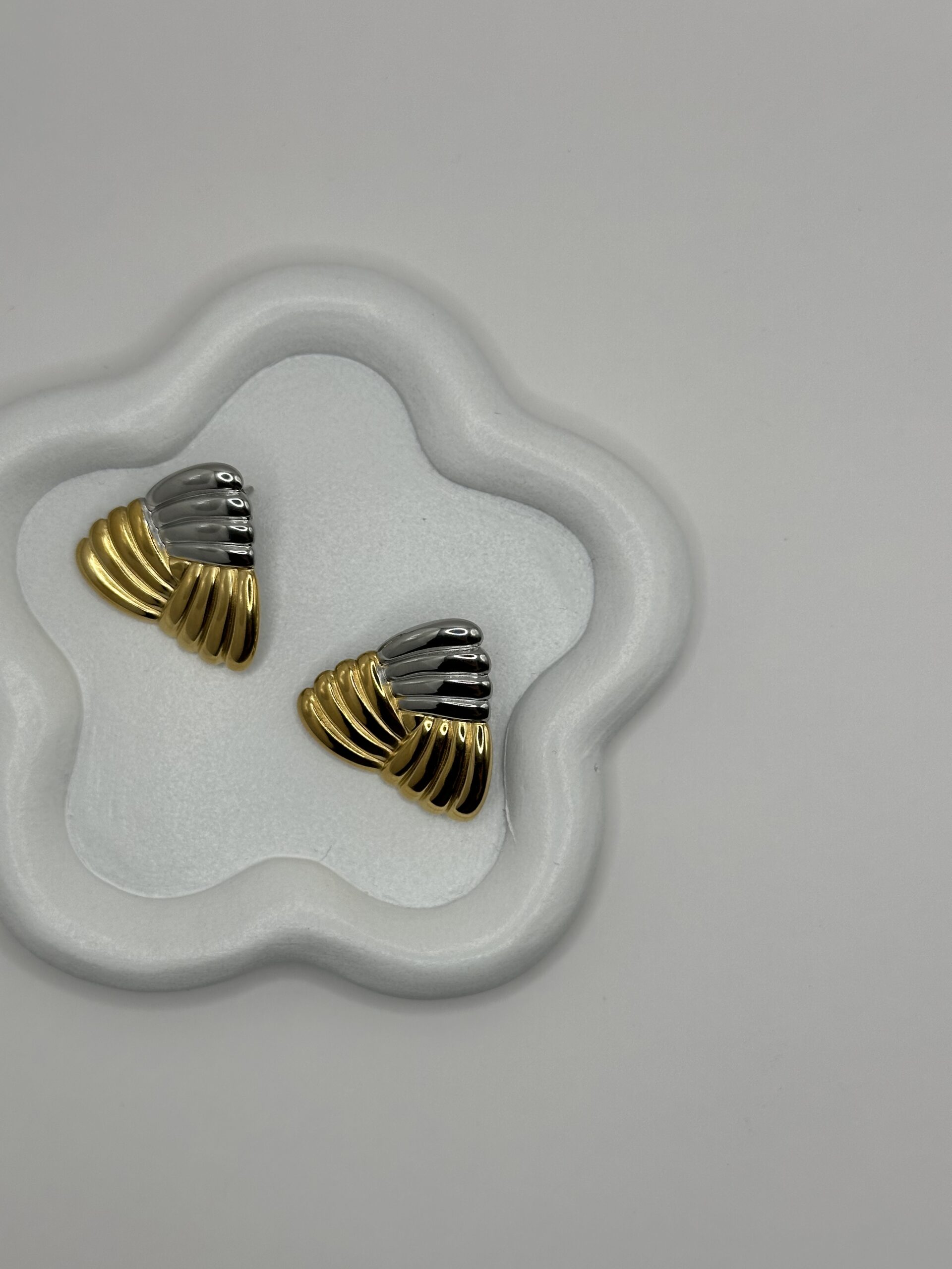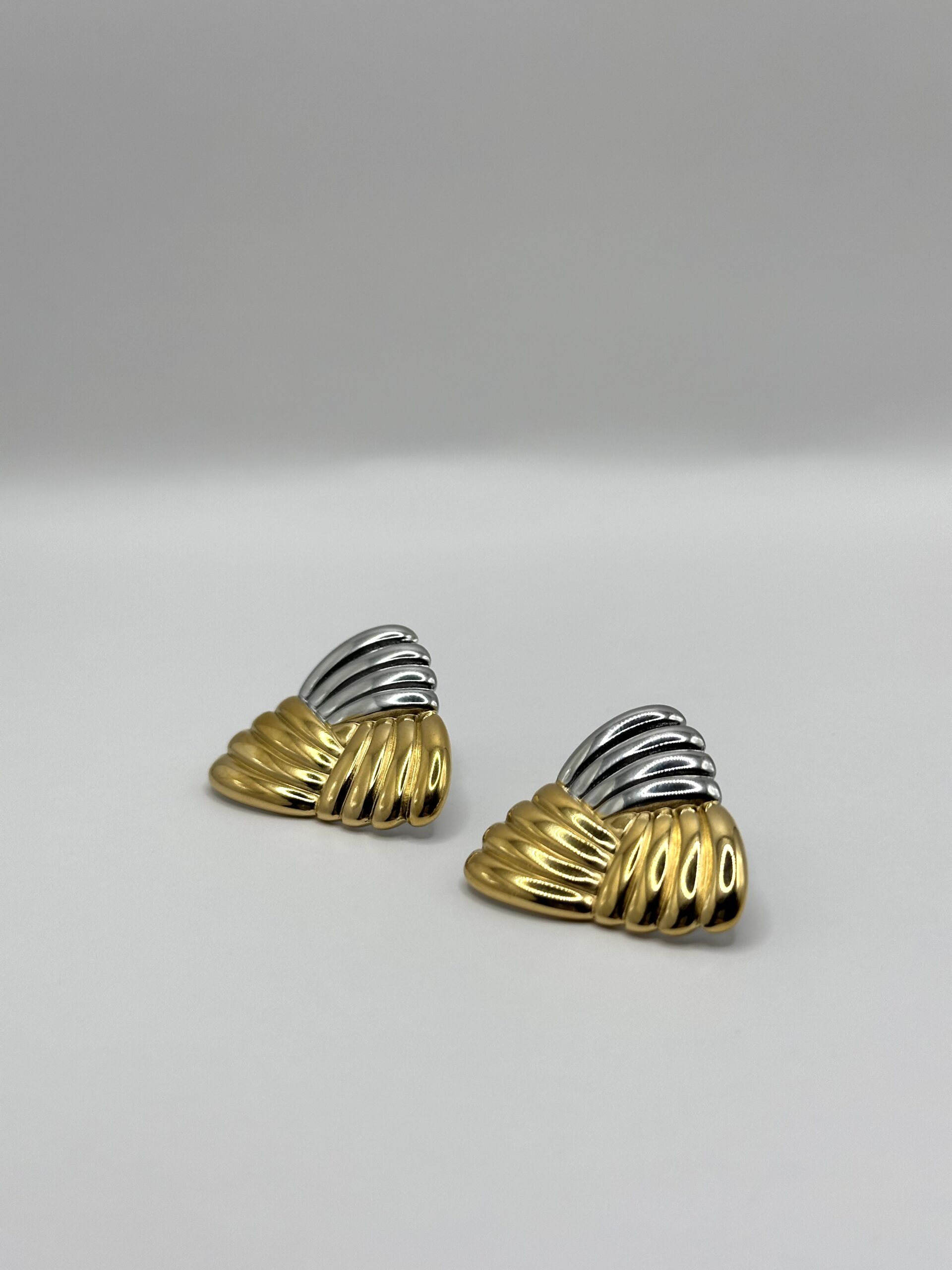 Εντυπωσιακά δίχρωμα σκουλαρίκια σε χρυσό και ασημί τόνο, με ανάγλυφο κυματιστό σχέδιο που αποπνέει δυναμισμό και κομψότητα. Ένα μοντέρνο αξεσουάρ που θα αναβαθμίσει κάθε σας εμφάνιση με τον πιο στυλάτο τρόπο.