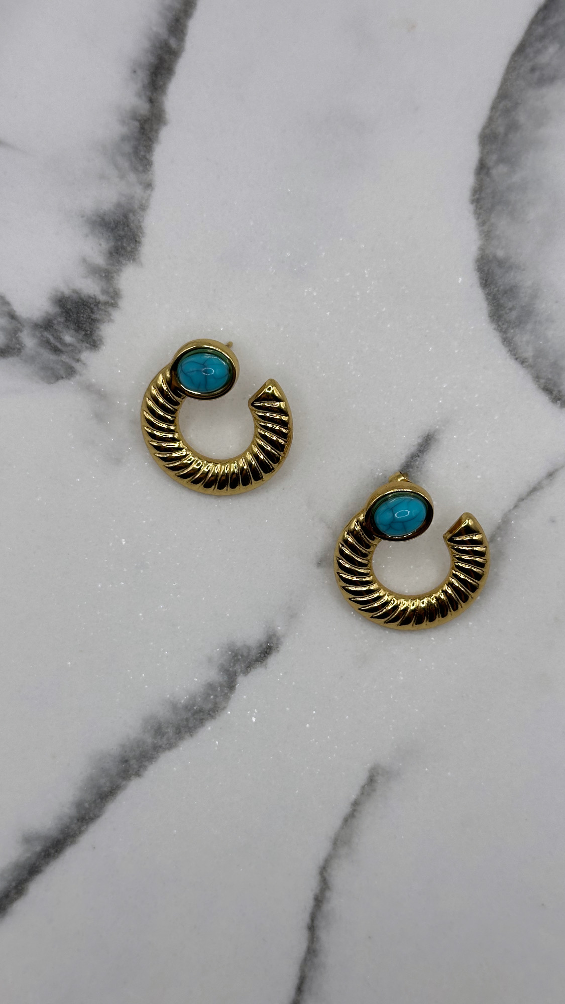 Σκουλαρίκια από ανοξείδωτο ατσάλι σε χρυσό τόνο, με σκαλιστή κυκλική βάση και τιρκουάζ πέτρα. Ανθεκτικά και κομψά, χαρίζουν έντονο ethnic χαρακτήρα και είναι ιδανικά για statement εμφανίσεις.