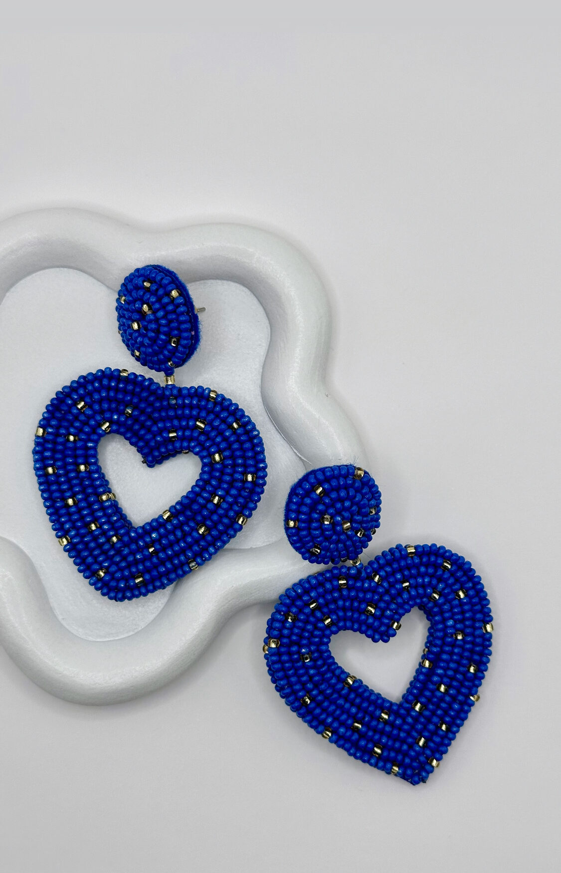 Χειροποίητα σκουλαρίκια σε σχήμα καρδιάς με μπλε και χρυσές χάντρες. Εντυπωσιακό σχέδιο που συνδυάζει ένταση χρώματος και boho διάθεση. Το τέλειο αξεσουάρ για καλοκαιρινά outfits αλλά και για να δώσεις μια ζωντανή πινελιά σε πιο απλές εμφανίσεις.