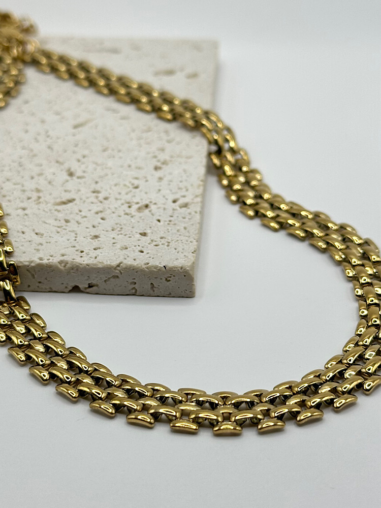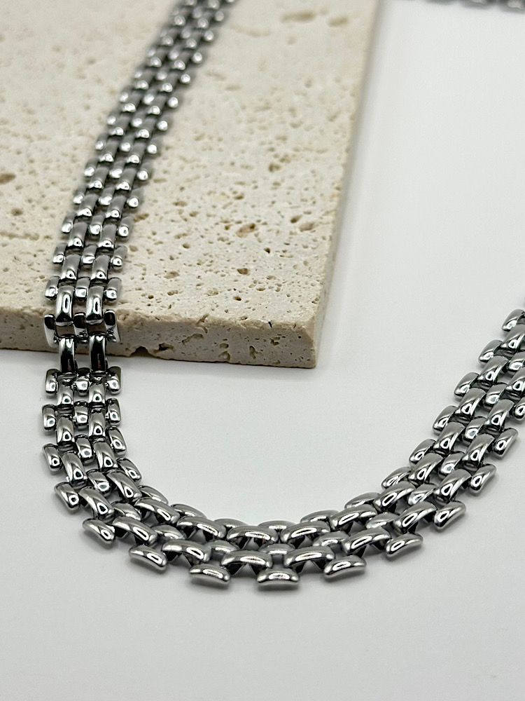 Εντυπωσιακό κολιέ από ανοξείδωτο ατσάλι, διαθέσιμο σε ασημί και χρυσό τόνο. Η ιδιαίτερη αλυσίδα τύπου πλέγμα χαρίζει bold και σύγχρονο χαρακτήρα, ενώ η στιβαρή κατασκευή του το καθιστά ιδανικό για statement εμφανίσεις. Χάρη στην ανθεκτικότητα του ατσαλιού, παραμένει λαμπερό και κομψό σε κάθε περίσταση.