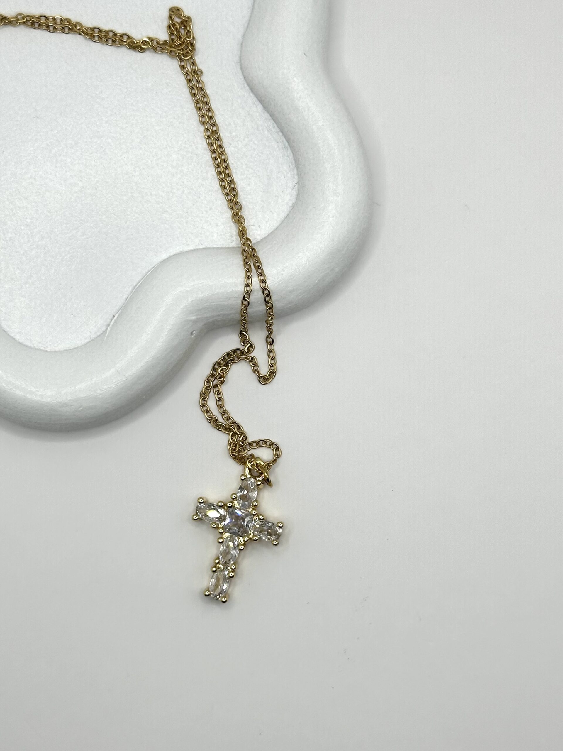 Κλασικό αλλά πάντα διαχρονικό κολιέ από ατσάλι με χρυσή αλυσίδα και εντυπωσιακό μενταγιόν σε σχήμα σταυρού. Ο σταυρός είναι διακοσμημένος με λαμπερά στρας που χαρίζουν κομψότητα και πολυτελή λάμψη σε κάθε εμφάνιση. Ένα κόσμημα με ιδιαίτερο συμβολισμό και ανθεκτικότητα, ιδανικό για να φορεθεί καθημερινά αλλά και σε ξεχωριστές περιστάσεις.