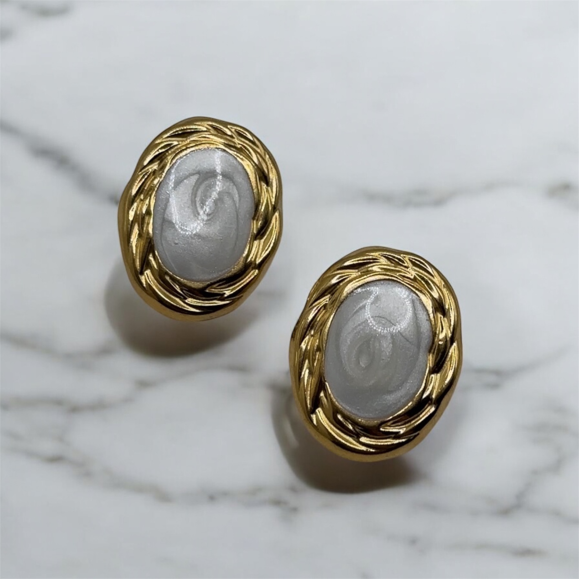 Κομψά σκουλαρίκια με ιδιαίτερο vintage χαρακτήρα. Οβάλ λευκή πέτρα με διακριτική γυαλάδα, αγκαλιασμένη από χρυσή πλέξη, συνθέτει ένα διαχρονικό σχέδιο που ταιριάζει σε κάθε περίσταση. Η σταθερότητα και η ανθεκτικότητα του ατσαλιού τα καθιστά ιδανικά για καθημερινή αλλά και πιο ιδιαίτερη χρήση.