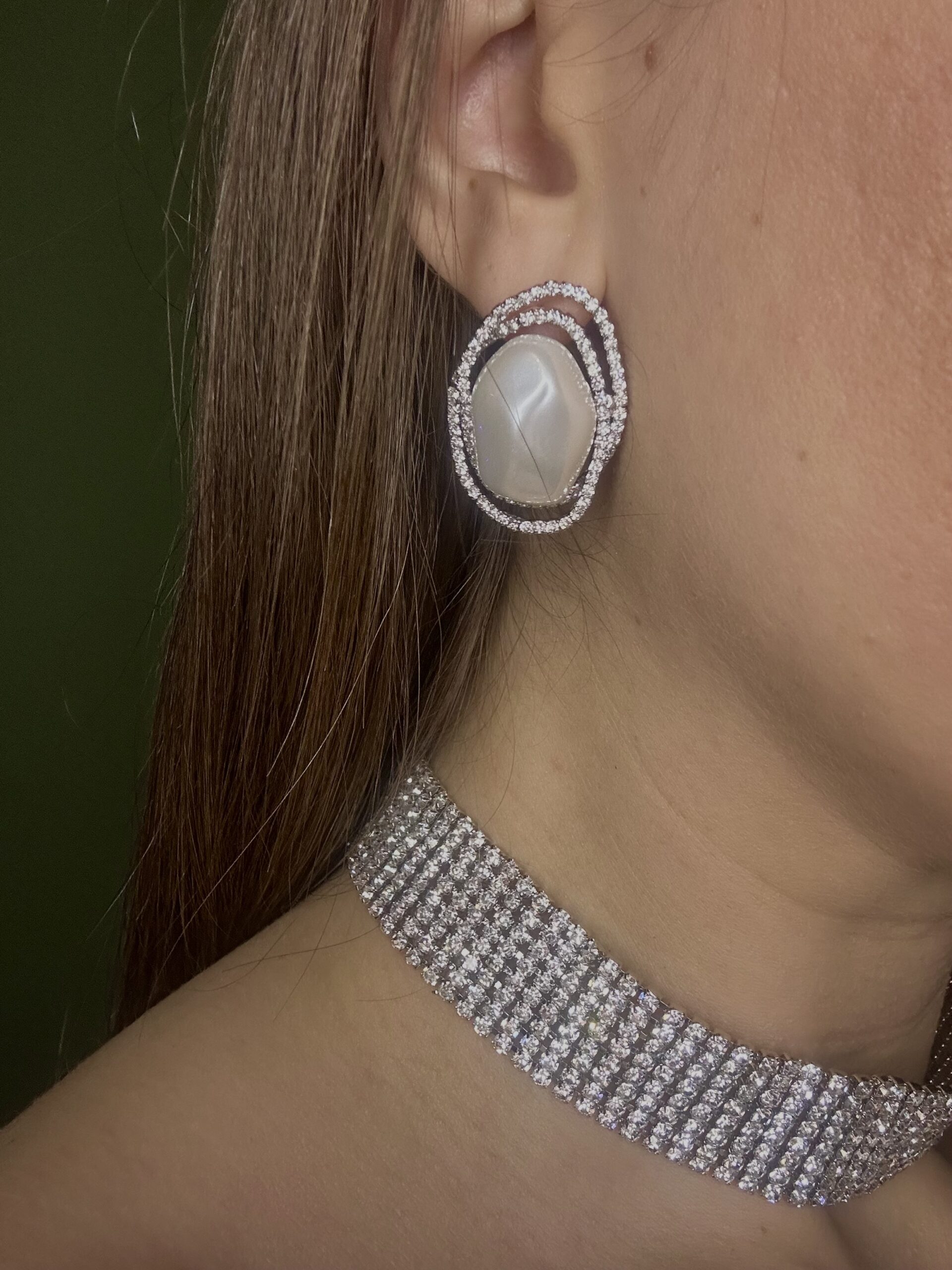 Λαμπερό τσοκέρ με πολλαπλές σειρές από λευκά στρας που δημιουργούν εκθαμβωτικό αποτέλεσμα. Ένα εντυπωσιακό κόσμημα που χαρίζει πολυτελή λάμψη και μετατρέπει κάθε εμφάνιση σε statement. Ιδανικό για βραδινές εξόδους, glam events και ιδιαίτερες περιστάσεις.