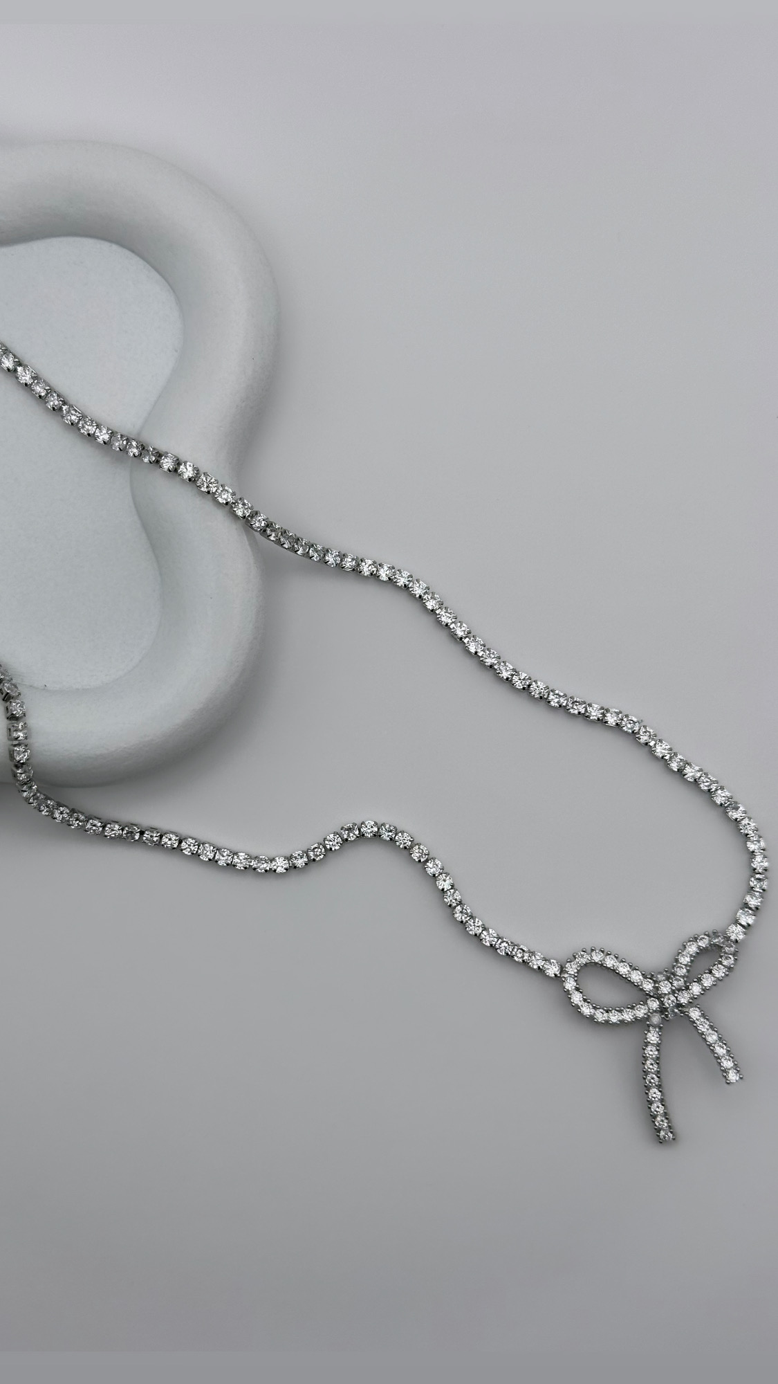 Κολιέ με λαμπερά λευκά ζιρκόνια σε όλο το μήκος και λεπτομέρεια φιόγκου που προσθέτει θηλυκότητα και φινέτσα. Ένα κόσμημα που ταιριάζει απόλυτα σε βραδινές εμφανίσεις, γάμους ή και για να αναβαθμίσει το πιο απλό outfit με μια δόση λάμψης.