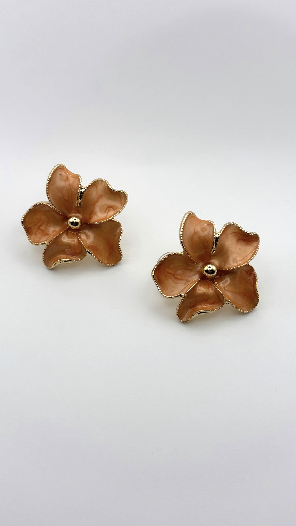 Σκουλαρίκια σε σχήμα λουλουδιού με ιδιαίτερη γυαλιστερή υφή σε γήινους καφέ τόνους. Ο χρυσός κεντρικός κόμπος αναδεικνύει τη λεπτομέρεια του σχεδίου και προσθέτει κομψότητα. Ένα μοναδικό κόσμημα που αποπνέει πολυτέλεια και αναδεικνύει με ξεχωριστό τρόπο κάθε εμφάνιση, από το πρωί έως το βράδυ.