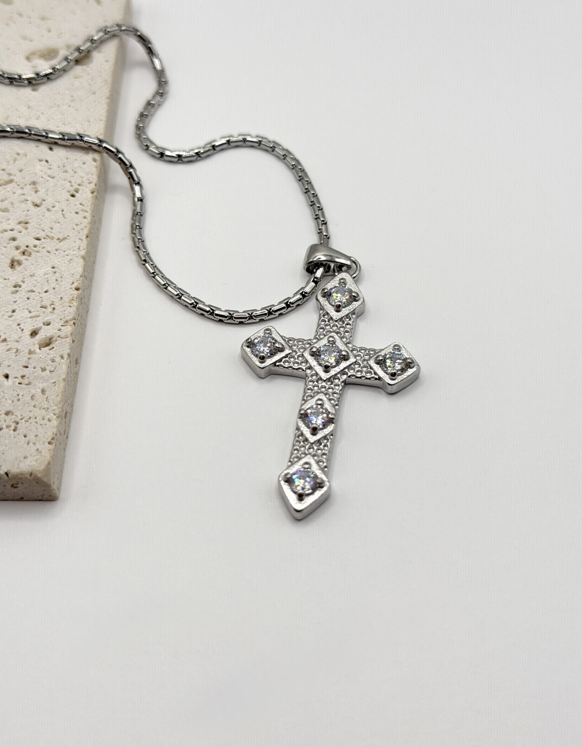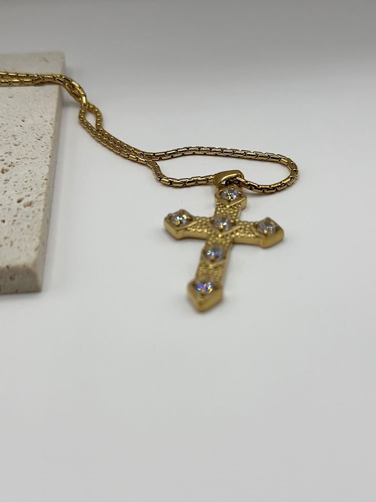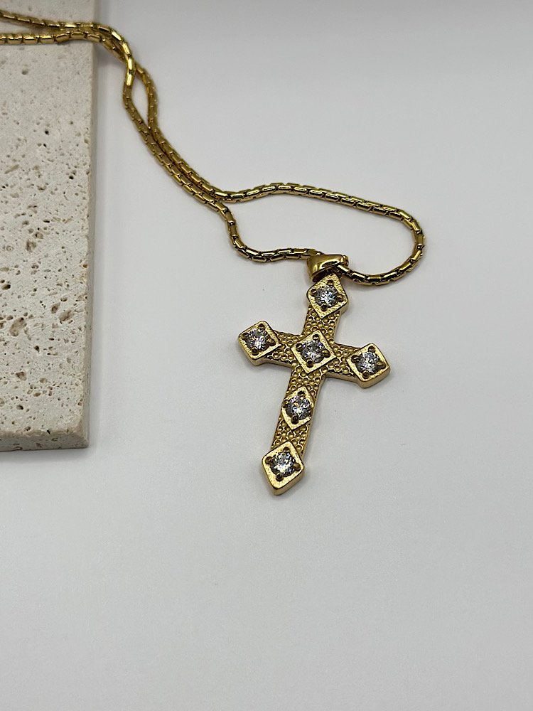 Κομψός σταυρός με ανάγλυφη υφή και διακοσμημένος με λαμπερά λευκά ζιργκόν σε κάθε άκρη. Ένα διαχρονικό κόσμημα που συνδυάζει τον συμβολισμό με την κομψότητα, ιδανικό για καθημερινή χρήση αλλά και για πιο ιδιαίτερες περιστάσεις. Διατίθεται σε χρυσό και ασημί τόνο, ώστε να επιλέξετε το στυλ που σας ταιριάζει.