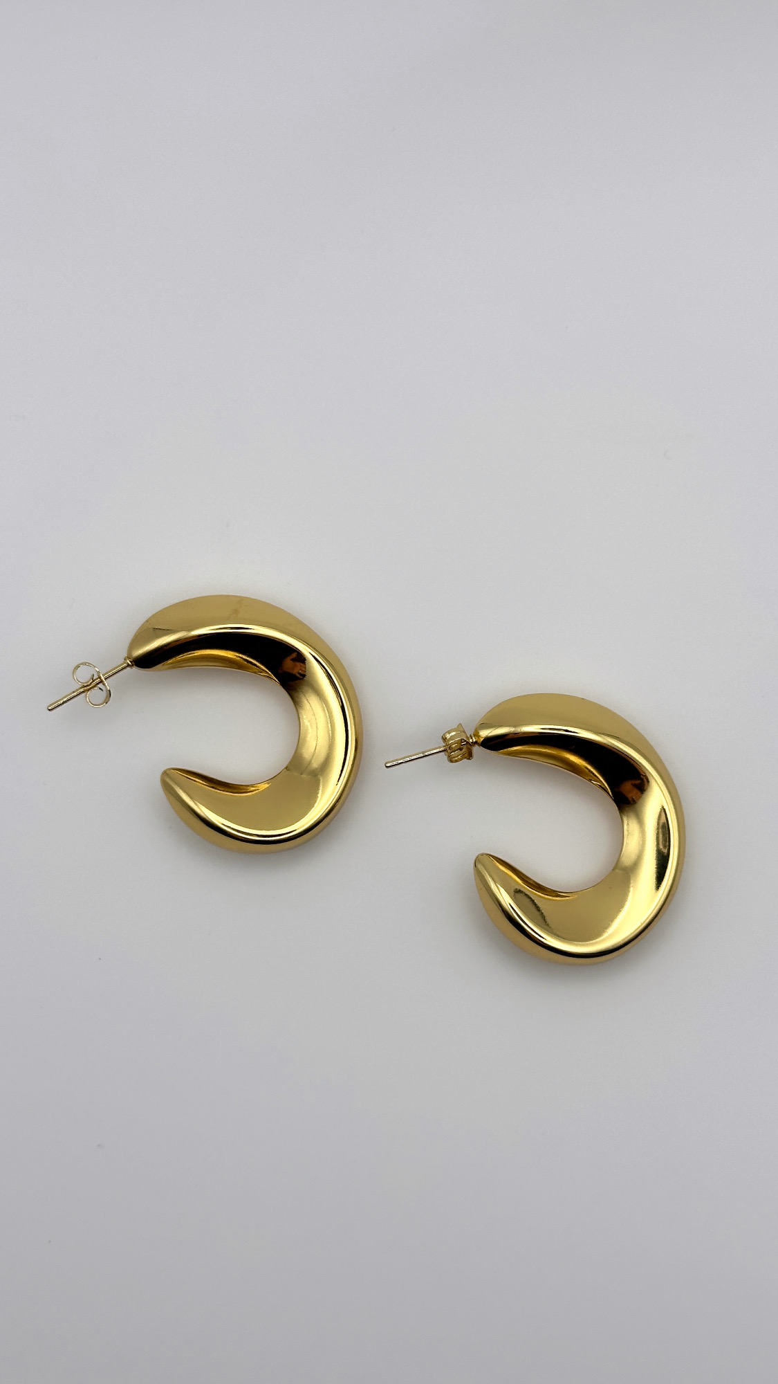 Σκουλαρίκια κρίκοι από ανοξείδωτο ατσάλι σε λαμπερό χρυσό χρώμα, με ιδιαίτερο καμπυλωτό σχέδιο που θυμίζει μισοφέγγαρο. Κομψά και εντυπωσιακά, δίνουν μοντέρνο χαρακτήρα σε κάθε εμφάνιση.