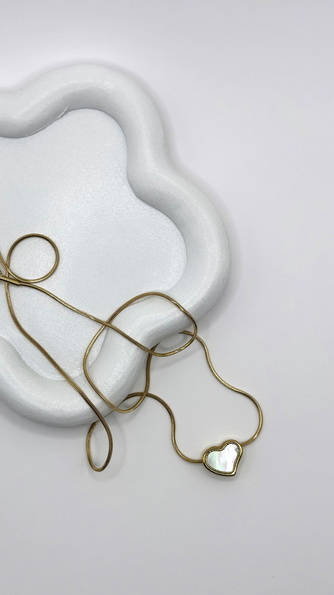 Κομψό κολιέ από ατσάλι με snake chain σε χρυσή απόχρωση και μενταγιόν καρδιά με όψη mother of pearl. Ο συνδυασμός του minimal σχεδιασμού με τη λάμψη του μαργαριταριού δημιουργεί ένα κόσμημα που αποπνέει διακριτική πολυτέλεια. Ανθεκτικό και εντυπωσιακό, αποτελεί ιδανική επιλογή για all day εμφανίσεις.