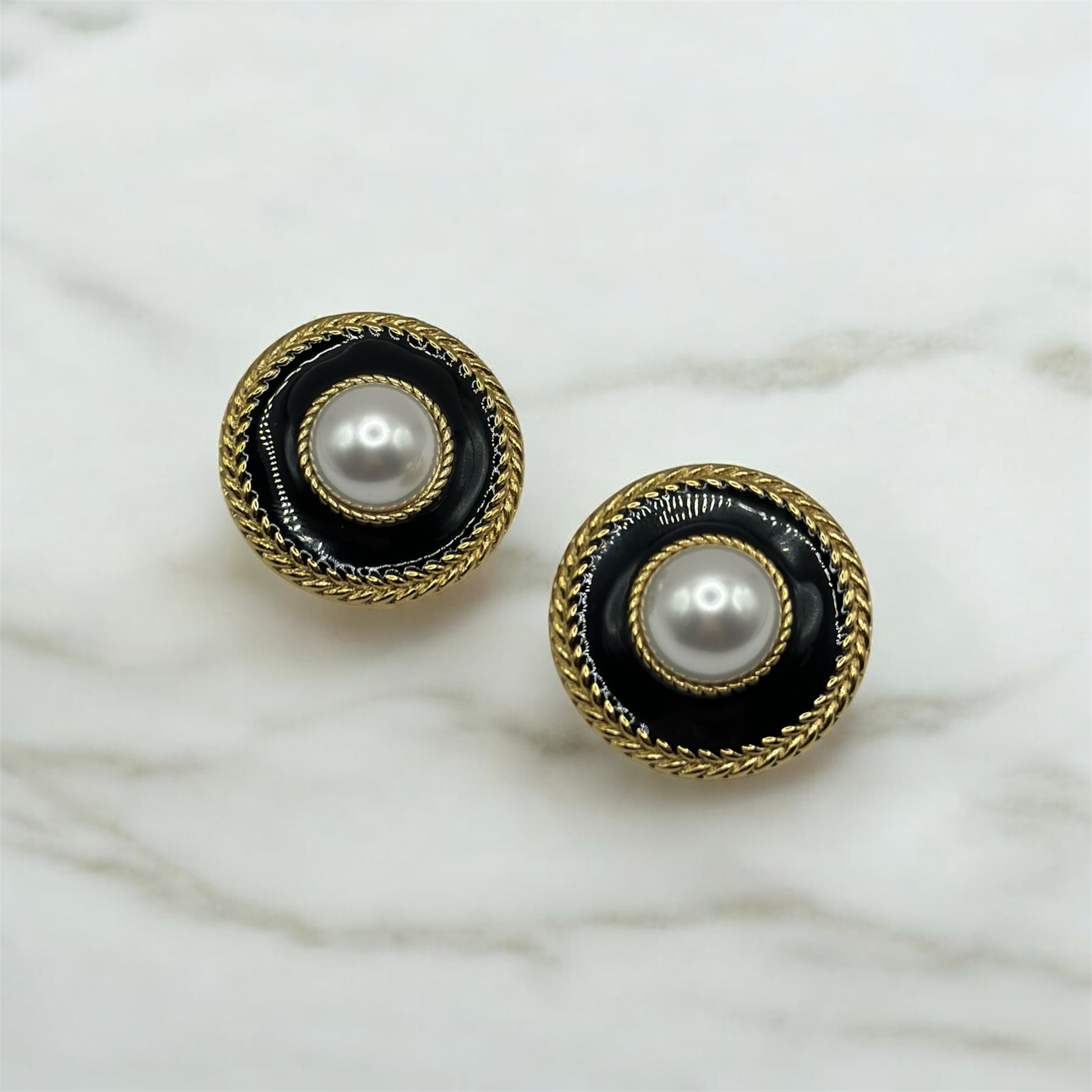 Κομψά και διαχρονικά, αυτά τα σκουλαρίκια με κυκλικό σχέδιο συνδυάζουν το μαύρο με το χρυσό, ενώ στο κέντρο τους δεσπόζει μια λαμπερή λευκή πέρλα. Με vintage αισθητική και elegant χαρακτήρα, αποτελούν το ιδανικό κόσμημα για να ολοκληρώσετε με στυλ τις πιο εκλεπτυσμένες εμφανίσεις σας.