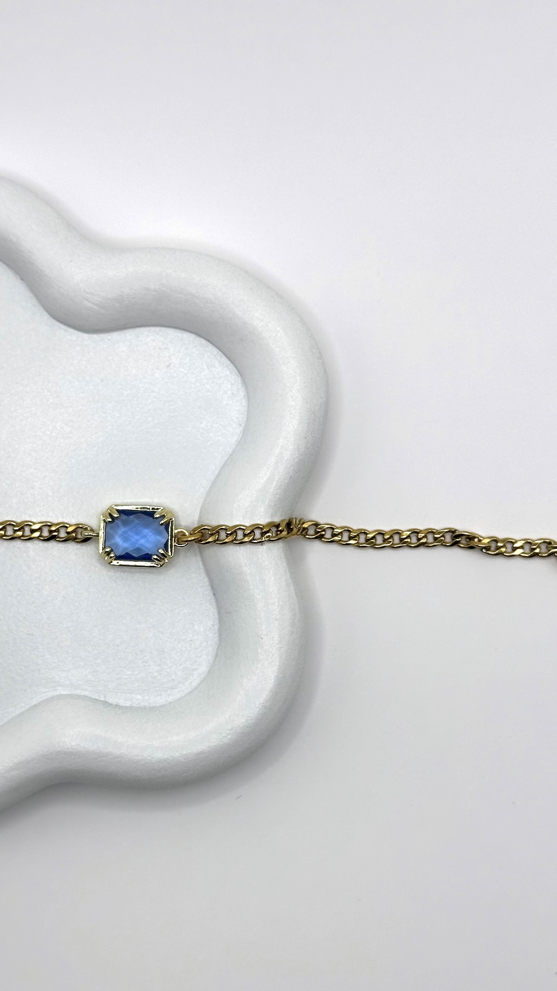 Κομψό βραχιόλι με χρυσή αλυσίδα και εντυπωσιακό τετράγωνο μπλε στοιχείο στο κέντρο. Ο μοντέρνος σχεδιασμός του προσδίδει λάμψη και στυλ σε κάθε εμφάνιση, ενώ το βαθύ μπλε χρώμα του δίνει ξεχωριστό χαρακτήρα. Ένα κόσμημα που μπορεί να φορεθεί μόνο του ή σε συνδυασμό με άλλα για ακόμα πιο elegant αποτέλεσμα.