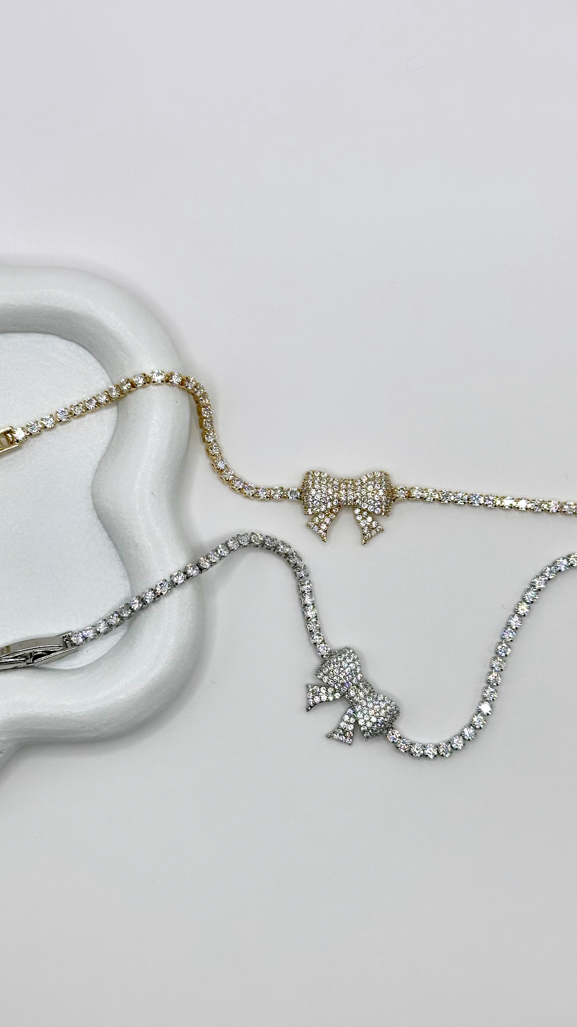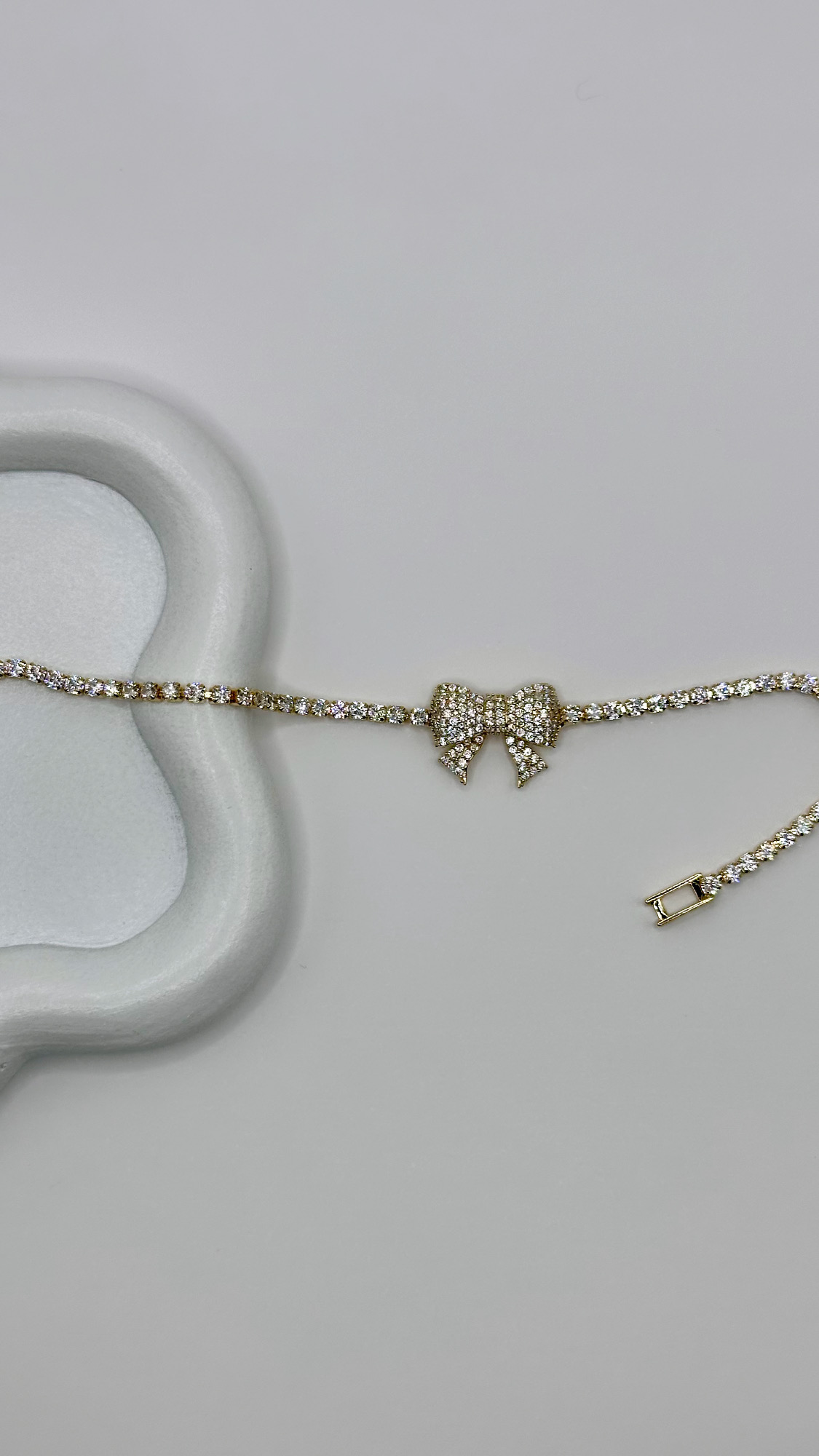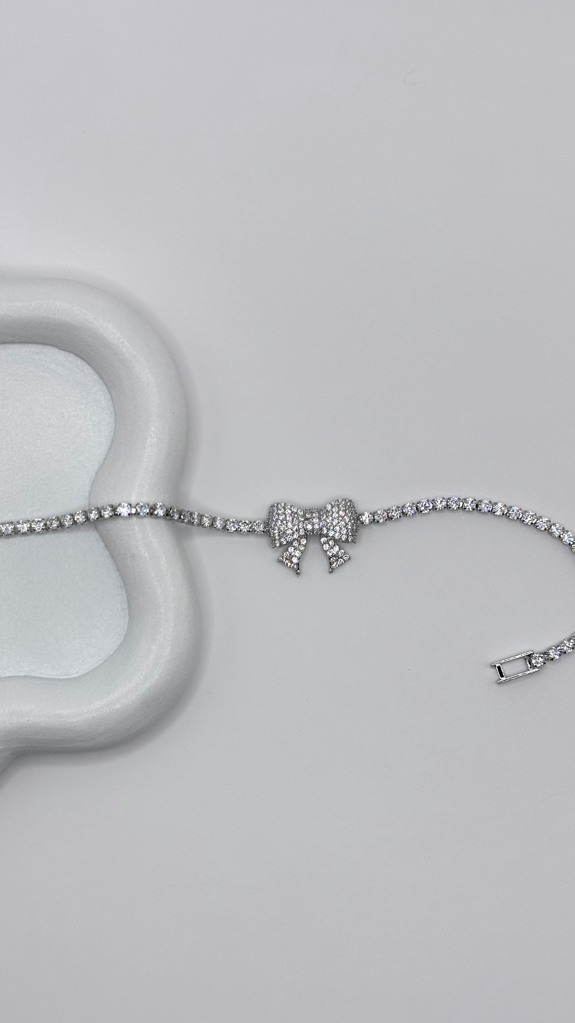 Tennis βραχιόλι με λαμπερά λευκά ζιργκόν και διακοσμητικό φιόγκο στο κέντρο. Ένα κομψό και ρομαντικό κόσμημα που συνδυάζει το διαχρονικό στυλ του tennis βραχιολιού με μια παιχνιδιάρικη και θηλυκή λεπτομέρεια. Ιδανικό για ιδιαίτερες περιστάσεις αλλά και για να δώσει λάμψη στην καθημερινότητά σας.
