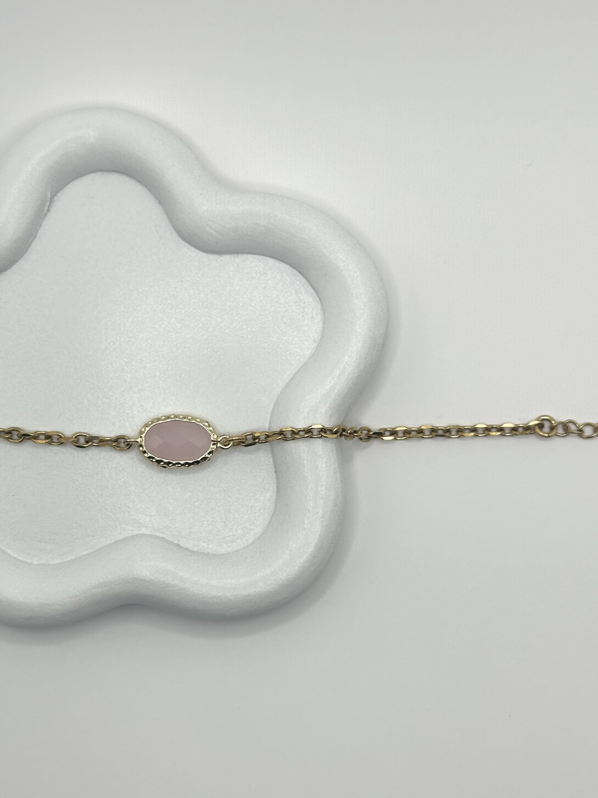 Λεπτεπίλεπτο βραχιόλι σε χρυσή απόχρωση, διακοσμημένο με οβάλ ροζ στοιχείο στο κέντρο. Ο μίνιμαλ σχεδιασμός του αποπνέει κομψότητα και θηλυκότητα, ενώ το διακριτικό του στυλ το καθιστά ιδανικό για καθημερινή χρήση αλλά και για πιο elegant εμφανίσεις.