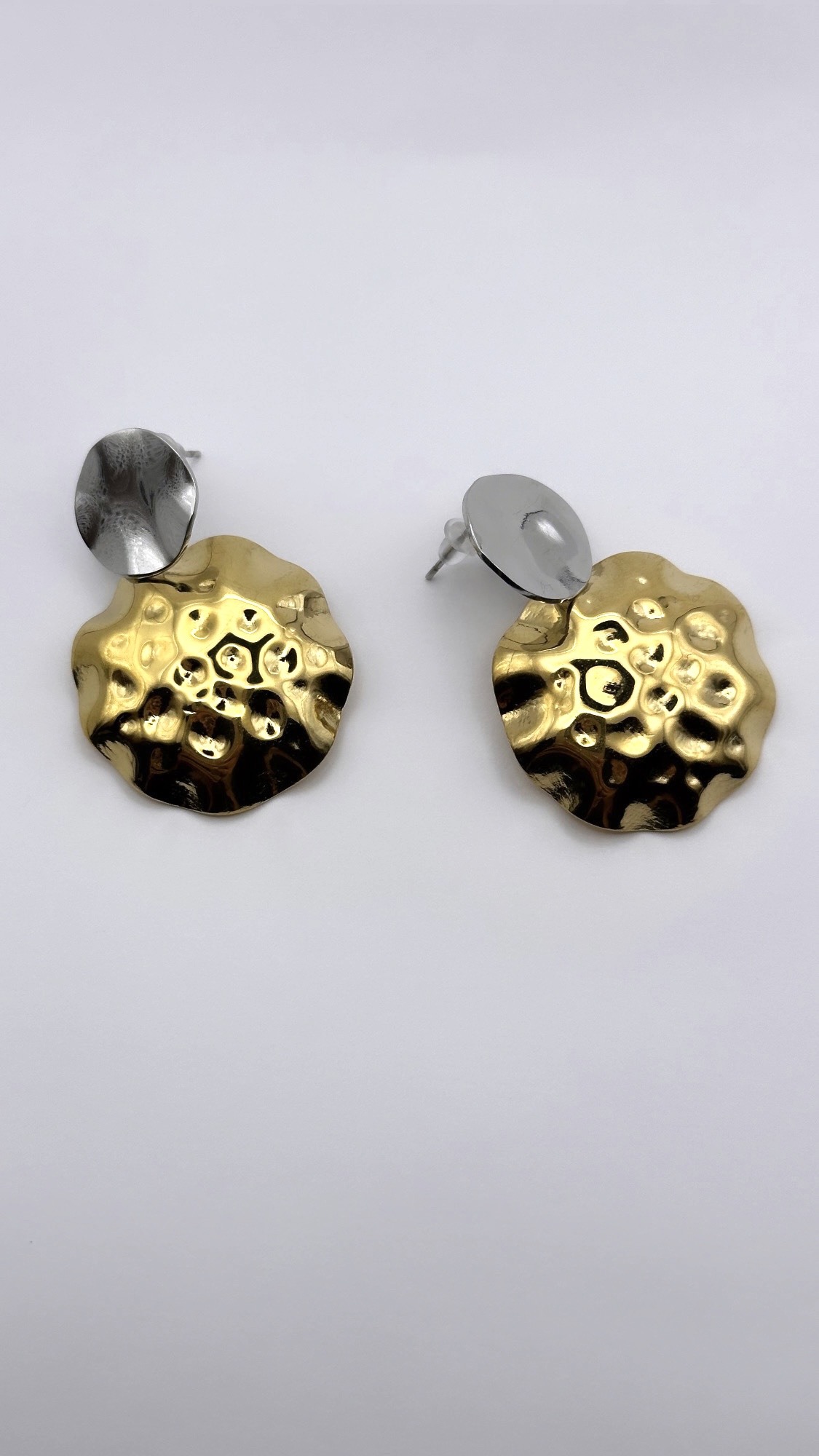 Σκουλαρίκια από ανοξείδωτο ατσάλι σε διχρωμία ασημί και χρυσού, με σφυρήλατη υφή που χαρίζει μοντέρνα αλλά και καλλιτεχνική αίσθηση. Ιδανικά για να δώσουν μια εντυπωσιακή πινελιά σε κάθε εμφάνιση.