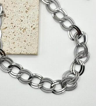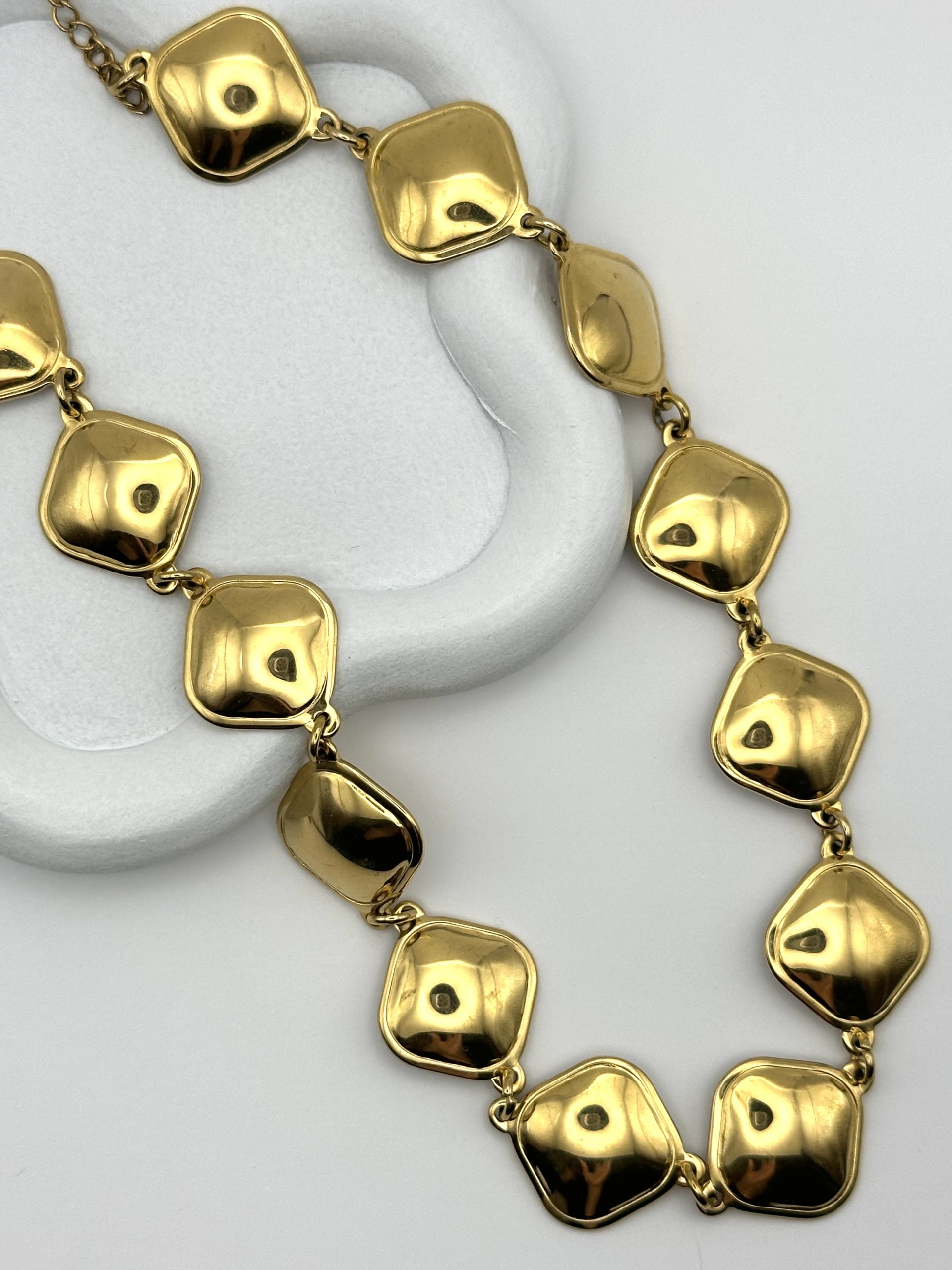 Κομψό και εντυπωσιακό κολιέ από ατσάλι με χρυσά τετράγωνα στοιχεία που ενώνονται σε μια ξεχωριστή αλυσίδα. Ο μοντέρνος αλλά και διαχρονικός σχεδιασμός του προσθέτει πολυτελή λάμψη σε κάθε εμφάνιση, ενώ χάρη στο ανθεκτικό υλικό του παραμένει αναλλοίωτο και δεν μαυρίζει. Ένα statement κόσμημα που απογειώνει κάθε look.