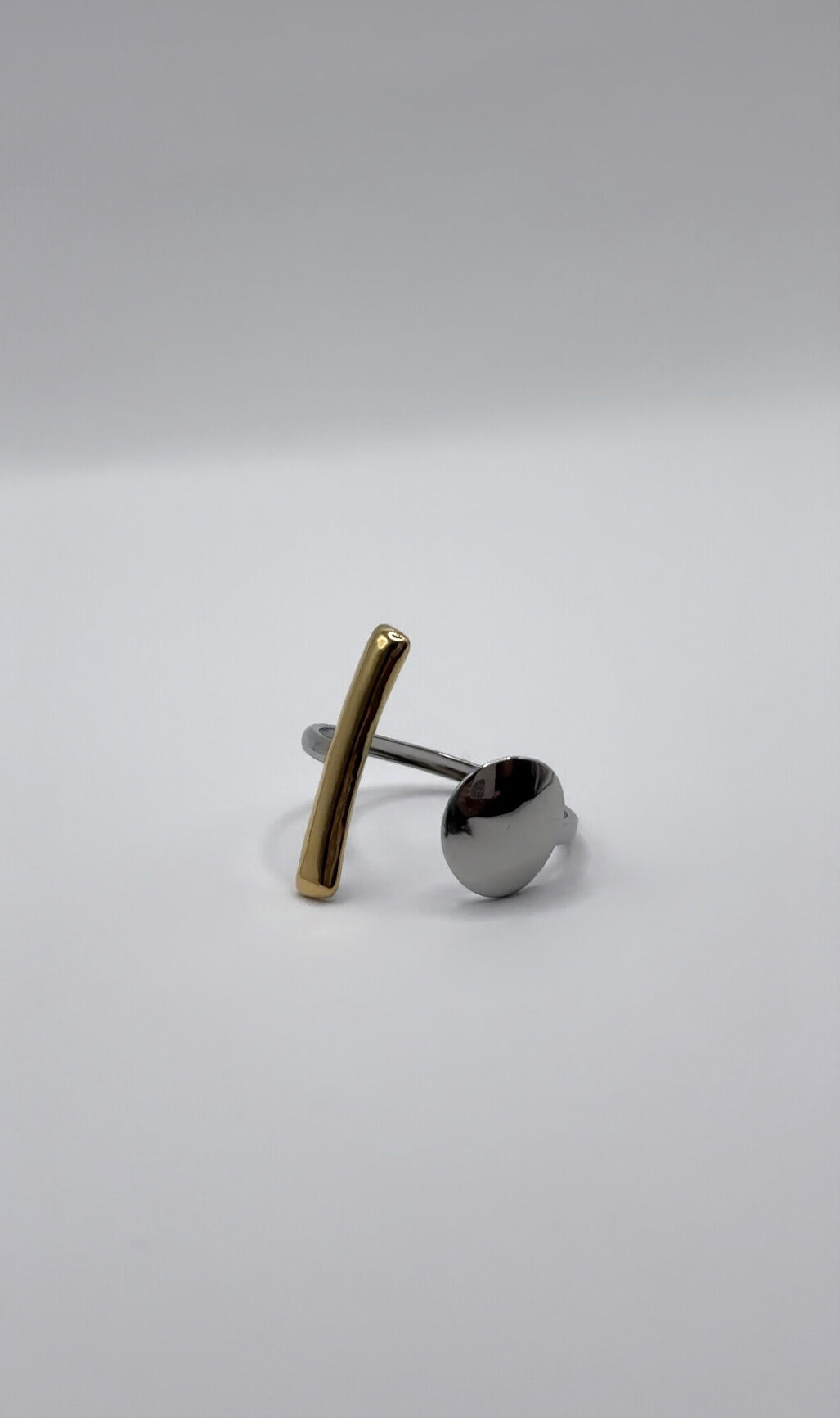 Minimal chic δαχτυλίδι από ατσάλι σε διχρωμία, με χρυσή μπάρα και ασημί κυκλικό δίσκο. Ένα μοντέρνο κόσμημα που συνδυάζει κομψότητα και statement διάθεση, ιδανικό για καθημερινές αλλά και πιο ιδιαίτερες εμφανίσεις.