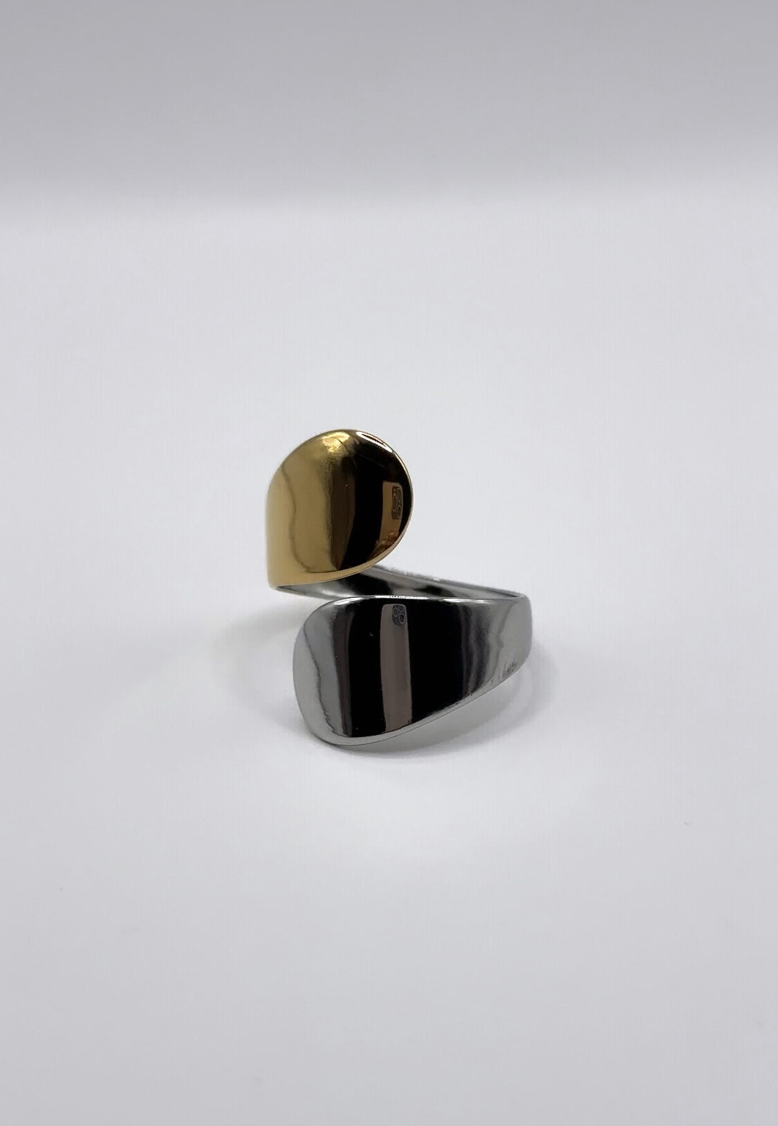 Κομψό δαχτυλίδι από ατσάλι με σχέδιο σταγόνας σε διχρωμία. Η δυναμική ένωση του χρυσού με το ασημί χαρίζει μοναδικό στυλ και χαρακτήρα, ενώ η minimal γραμμή του το κάνει ιδανικό για καθημερινή χρήση και ιδιαίτερες εμφανίσεις.