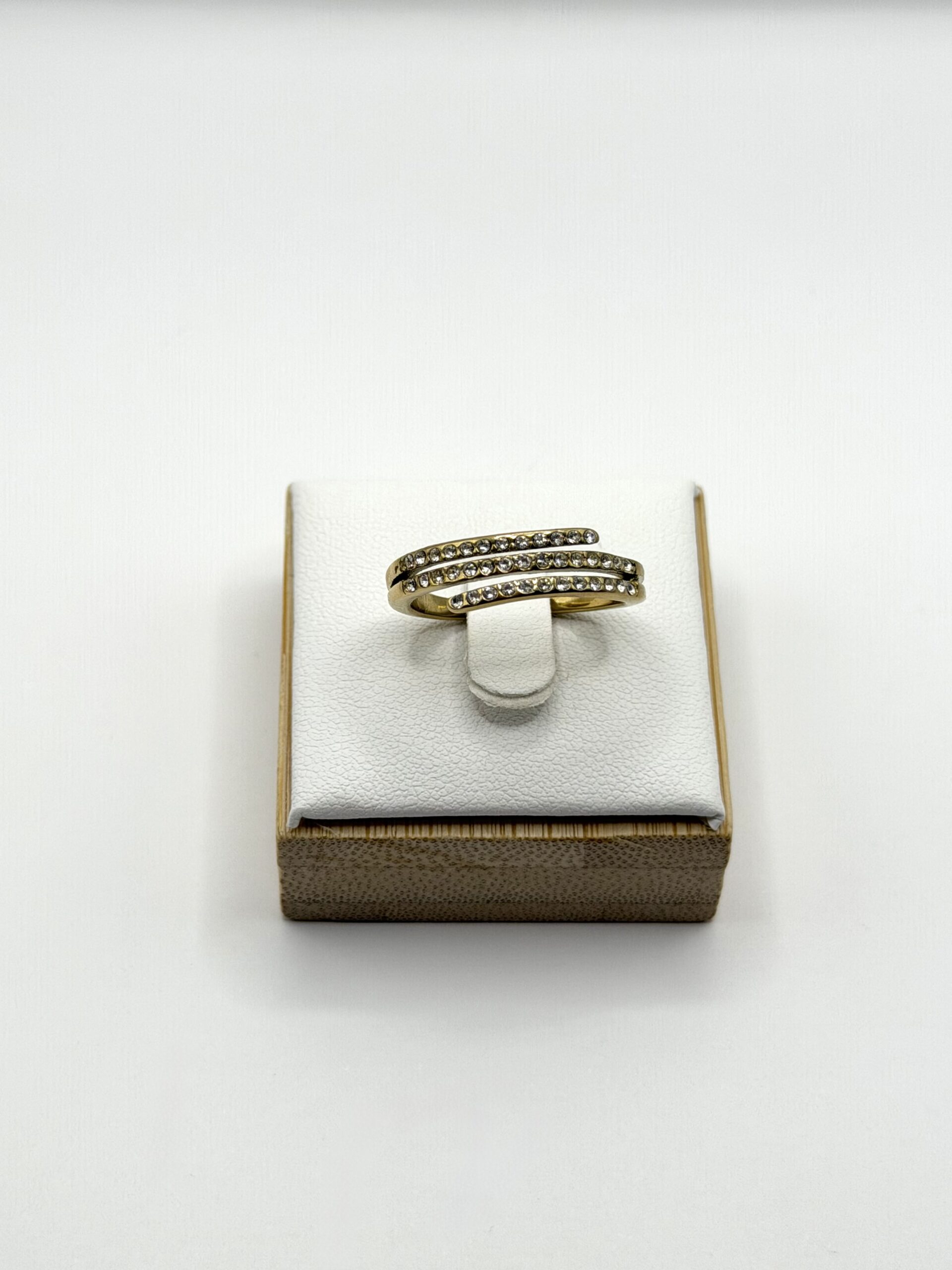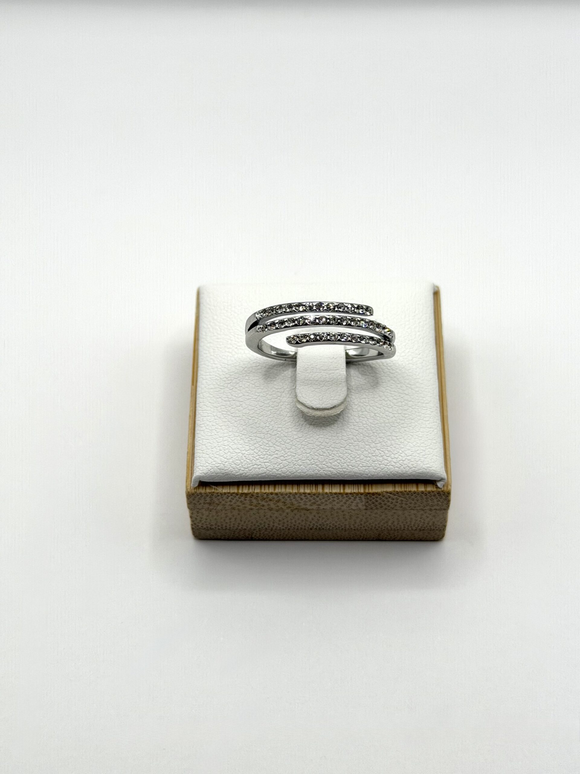 Κομψό δαχτυλίδι από ανοξείδωτο ατσάλι με μοντέρνο διπλό σχέδιο, στολισμένο με λαμπερά κρυσταλλάκια που χαρίζουν διακριτική λάμψη. Ιδανικό για να ολοκληρώσει κάθε εμφάνιση, από το καθημερινό στυλ έως τις πιο ιδιαίτερες στιγμές.