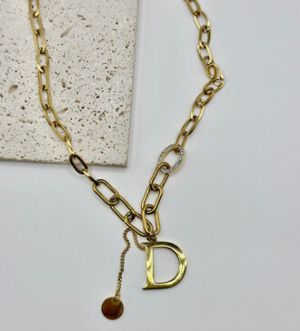 Ένα εντυπωσιακό κολιέ με chunky αλυσίδα από ανοξείδωτο ατσάλι που παραμένει λαμπερό και ανθεκτικό στη φθορά. Το μεγάλο κρεμαστό γράμμα D, μαζί με τις λαμπερές λεπτομέρειες, χαρίζουν μοντέρνο χαρακτήρα και κομψότητα σε κάθε εμφάνιση. Ιδανικό για layering αλλά και για να φορεθεί μόνο του ως statement piece. ✨ Χαρακτηριστικά: Υλικό: Ανοξείδωτο ατσάλι Μοντέρνος σχεδιασμός με…
